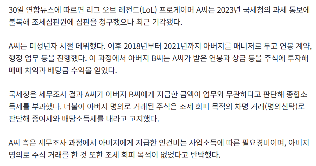 유명 프로게이머가 부친의 계좌를 통해 주식거래를 해온 것으로 밝혀졌다. 국세청이 이러한 행위를 세금회피 의혹으로 적발했다는 소식이다.해당 게이머는 아버지 명의의 통장으로 주식 매매를 진행해왔으며, 국세청의 조사 과정에서 이 같은 사실이 드러나게 됐다.