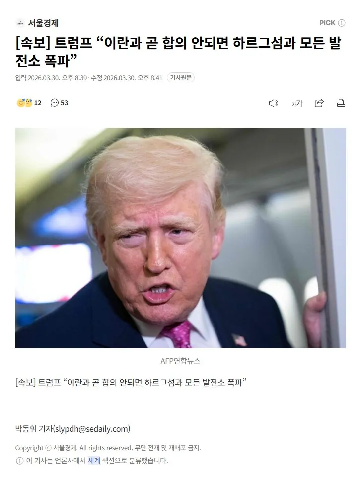 [속보] 트럼프 "이란과 곧 합의 안되면 하르그섬과 모든 발전소 폭파"