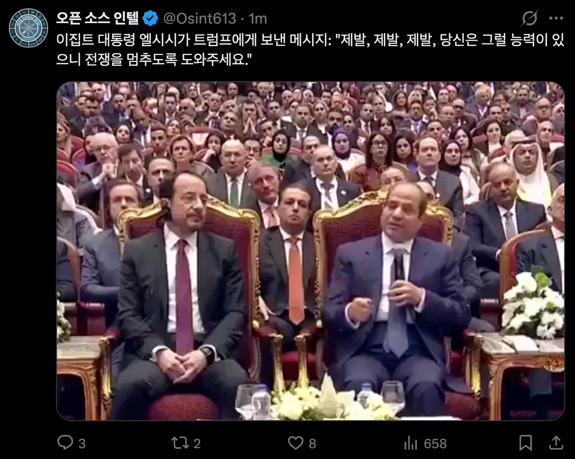 이집트 대통령 엘시시가 트럼프 대통령을 향해 직접 메시지를 보냈다. 그는 중동 지역, 특히 걸프 만에서 현재의 전쟁을 끝낼 수 있는 인물은 트럼프밖에 없다고 강조했다.