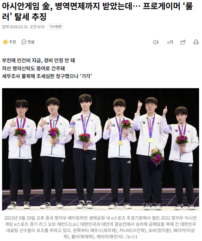 아시안게임 金, 병역면제까지 받았는데… 프로게이머 ‘룰러’ 탈세 추징