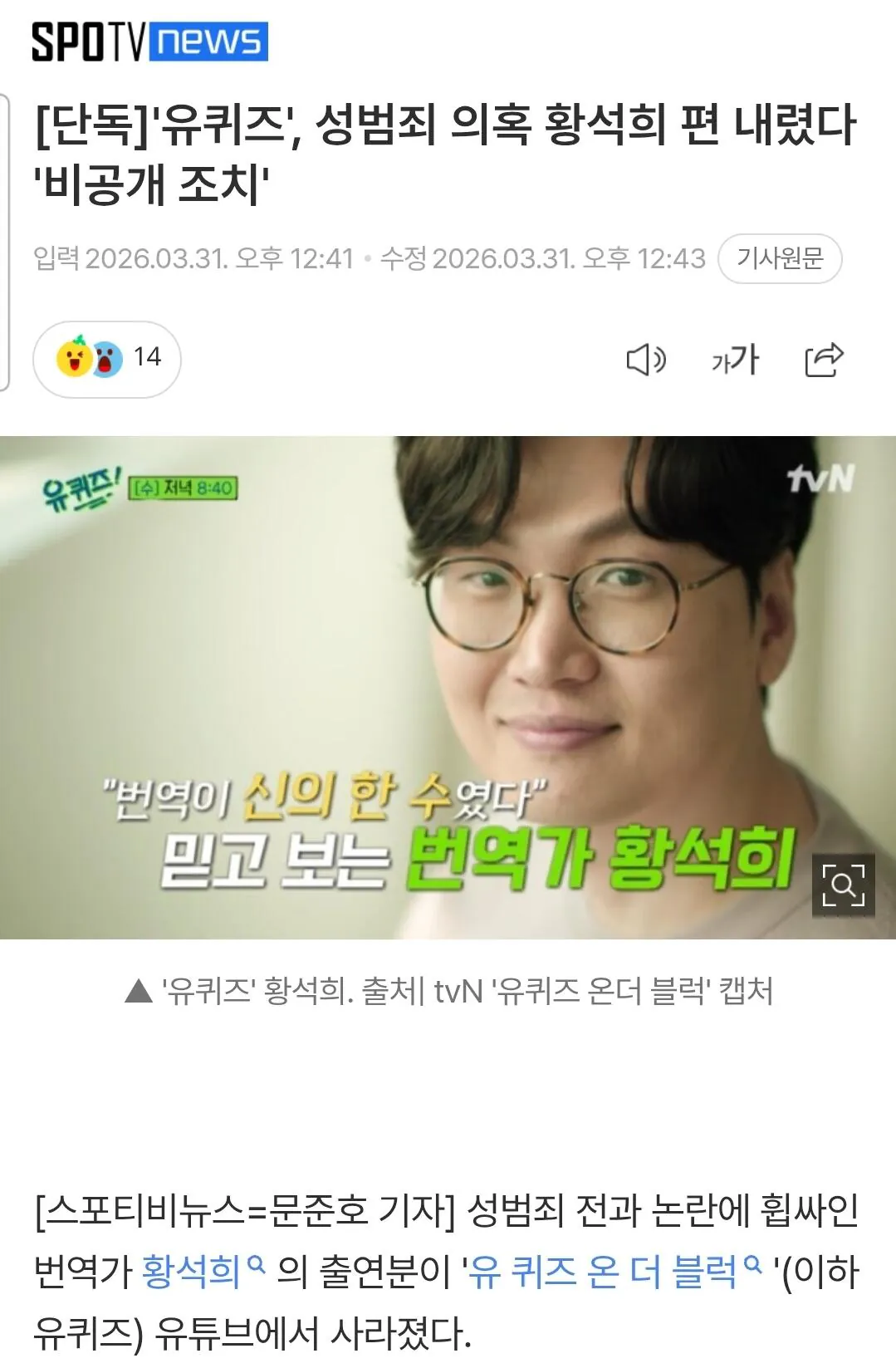 [단독]'유퀴즈', 성범죄 의혹 황석희 편 내렸다 '비공개 조치'