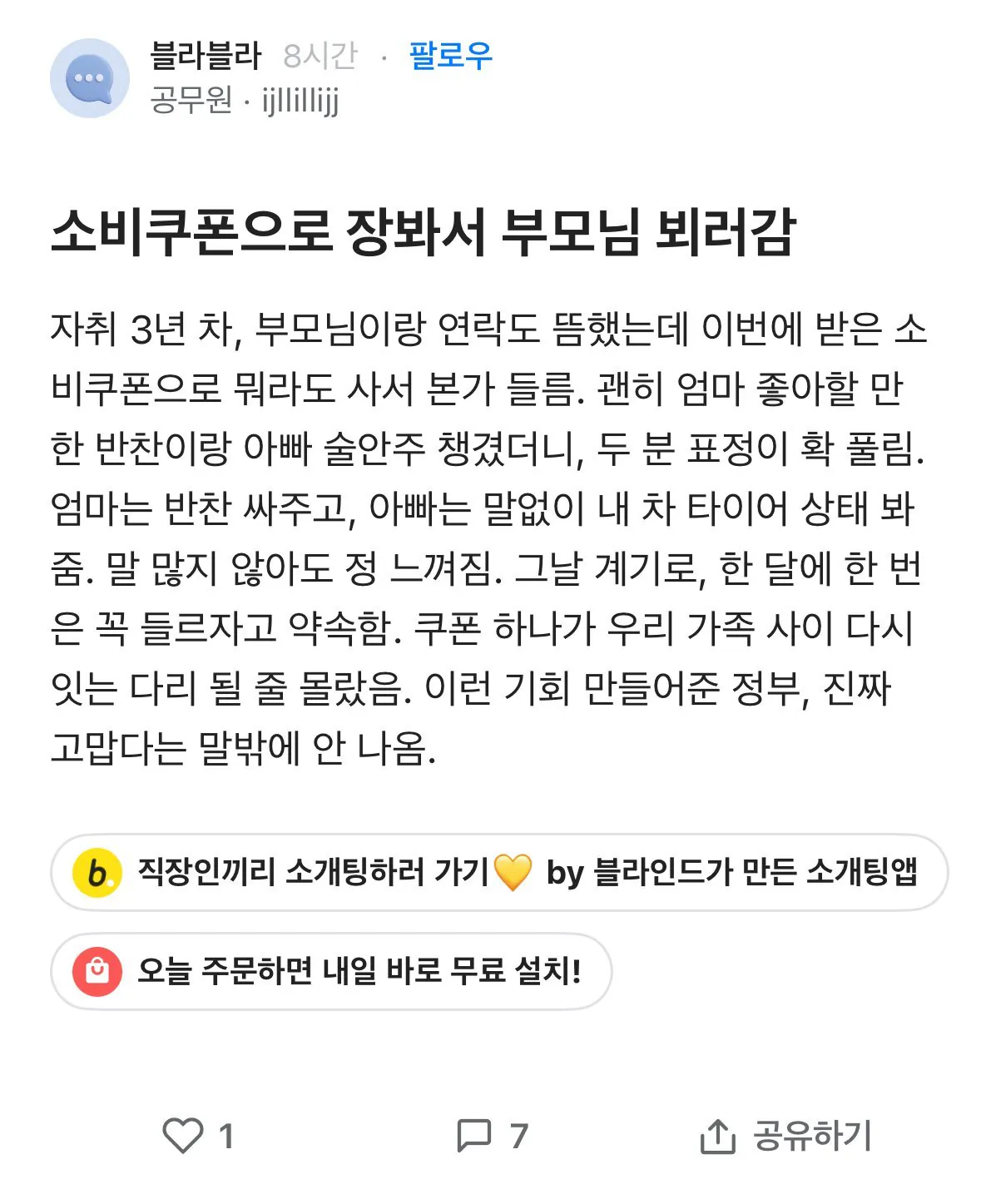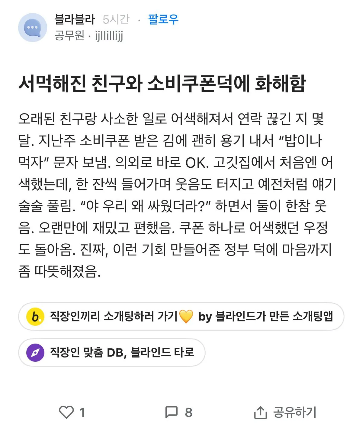 어떤 친구가 지원금 받고부터 주변사람들이랑 사이가 좋아졌다고 자랑질 좀 하더라