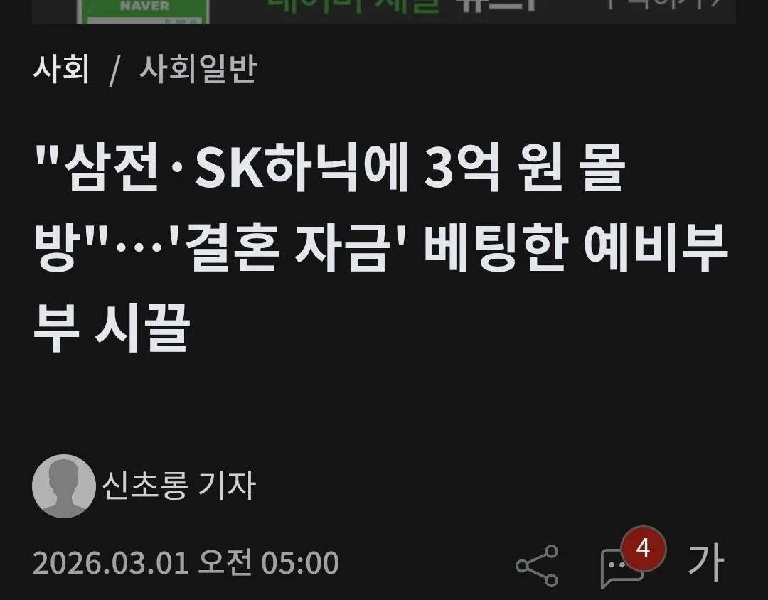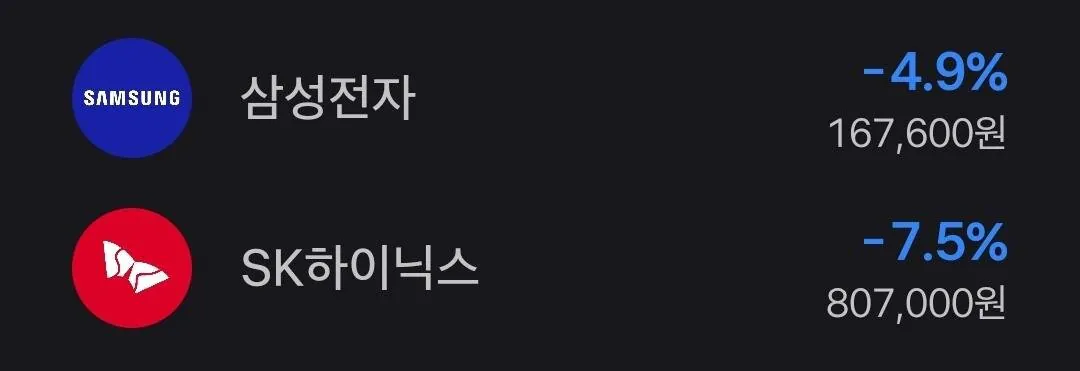 당시 삼성전자 주가가 199,700원, 하이닉스가 1,002,000원일 때 각각 1억5천씩 들었다고 한다. 지금은 삼성전자 167,600원, 하이닉스 808,000원까지 내려갔다네. 삼성전자는 약 2,400만 원 손해에 -16% 손실률, 하이닉스도 약 2,900만 원 손해에 -19.3% 손실률이라고 한다. 총 3억 투자했는데 지금 평가금이 2억 4,700만 원 정도밖에 안 남아서, 결국 5,300만 원을 날린 셈이라더라. 수익률로는 -17~18% 정도 된다고.