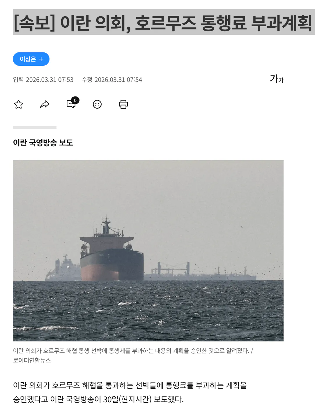 이란이 호르무즈 해협을 통과하는 배들한테 통행료를 받기로 결정했다. 의회에서 공식으로 승인한 거다.