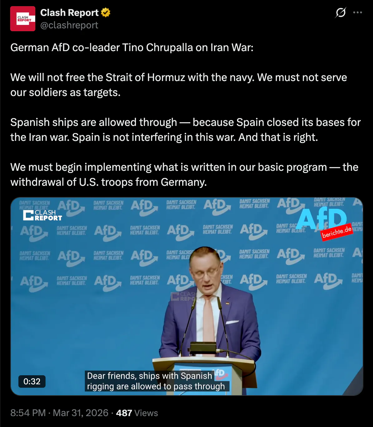 크루팔라 당대표는 "호르무즈 해협 작전은 우리 병사들만 위험에 빠뜨릴 뿐"이라며 "그 지역 분쟁에 독일이 개입할 이유가 없다"고 밝혔다. 스페인을 근거로 들면서 "스페인처럼 자국 기지 사용을 막으면 자동으로 전쟁에서 벗어나게 된다"고 설명했다.