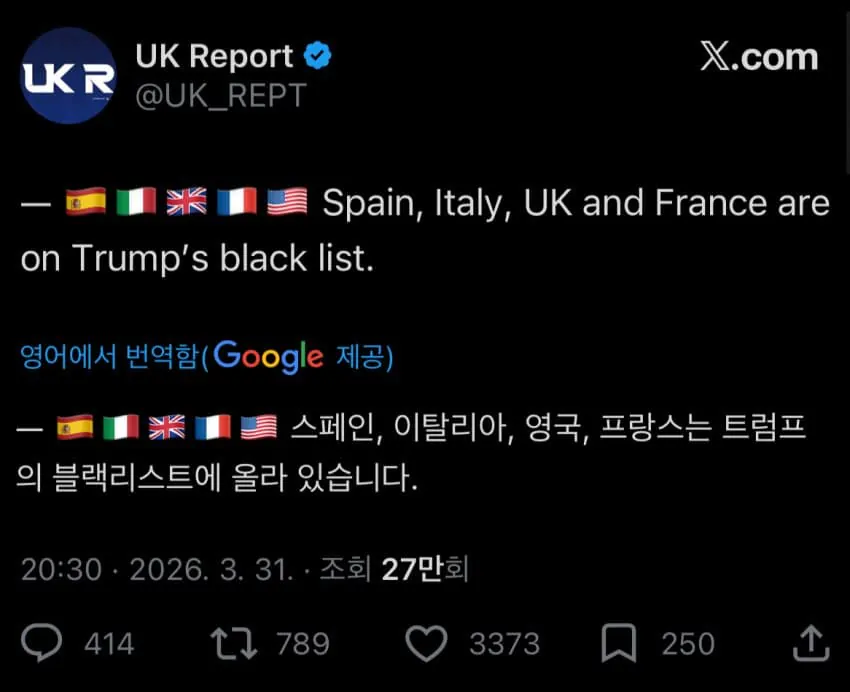스페인, 이탈리아, 영국, 프랑스. 이 나라들이 뭐하길래 트럼프한테 군사 지원까지 끊겼을까?최근 트럼프가 불만을 터뜨렸던 그 나라들이 뭔가 공통점을 가지고 있다고 하는데, 정확히 뭐가 같은 건지 한번 생각해보자. 이들은 트럼프의 정책에 대해 부정적이었던 국가들이고, 그게 이번 결정으로 이어진 것 같다.