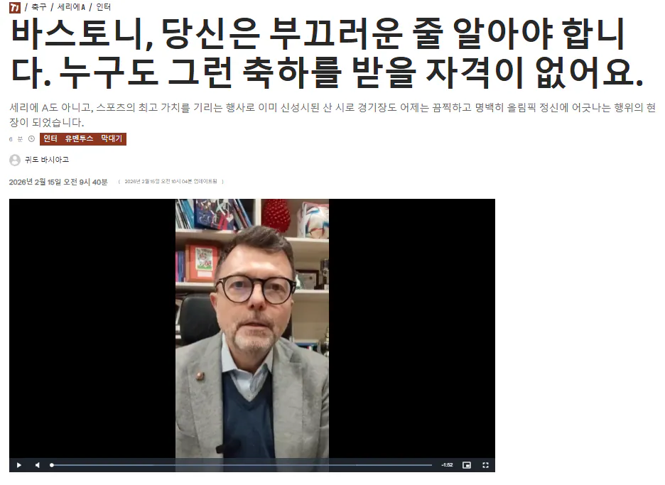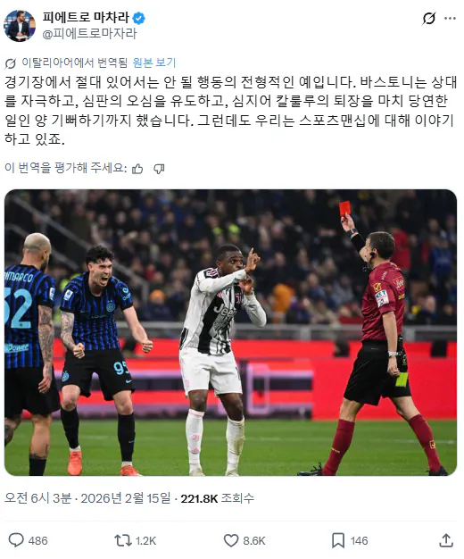 바스토니가 2월 유벤투스-인테르전에서 과격한 태클로 상대를 퇴장시킨 뒤 인사까지 했는데, 그 장면이 심판 카메라에 다 박혔어