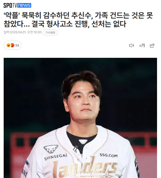 추신수가 악플 전쟁에서 공식 항복을 선언했다.공인이라는 이유로 자신에 대한 무분별한 비난은 참아 왔었다.하지만 가족까지 대상이 되자 상황은 달라졌다.법정으로 직접 나가기로 결정한 것이다.악성 댓글 주인공들을 모욕죄, 명예훼손죄로 고소할 예정이며, 증거 자료는 이미 여러 커뮤니티에서 모두 모아둔 상태.법률 전문가 투입으로 본격적인 소송 준비에 돌입했다는 후문이다.