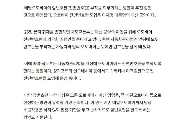 대선공약, 배달 오토바이 앞번호판 부착 의무화 추진 중