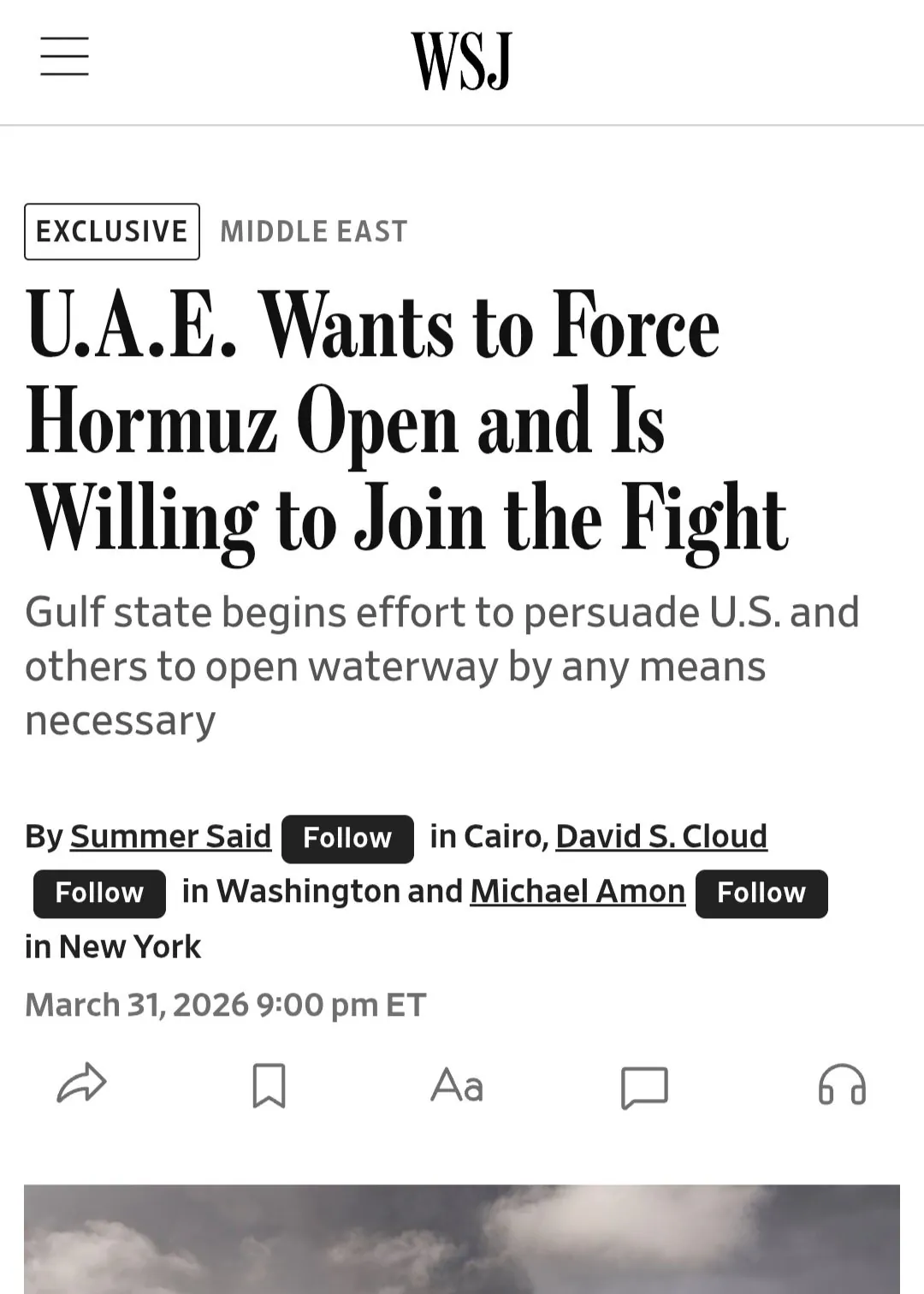 트럼프 측이 호르무즈 해협은 니네가 알아서 처리하라는 입장을 보이자 UAE가 주도적으로 나서고 있다는 소식. 아시아와 유럽의 우호국들을 대상으로 적극적인 외교 활동을 펼치면서 국제 연합을 구성하려는 중이라고 함.