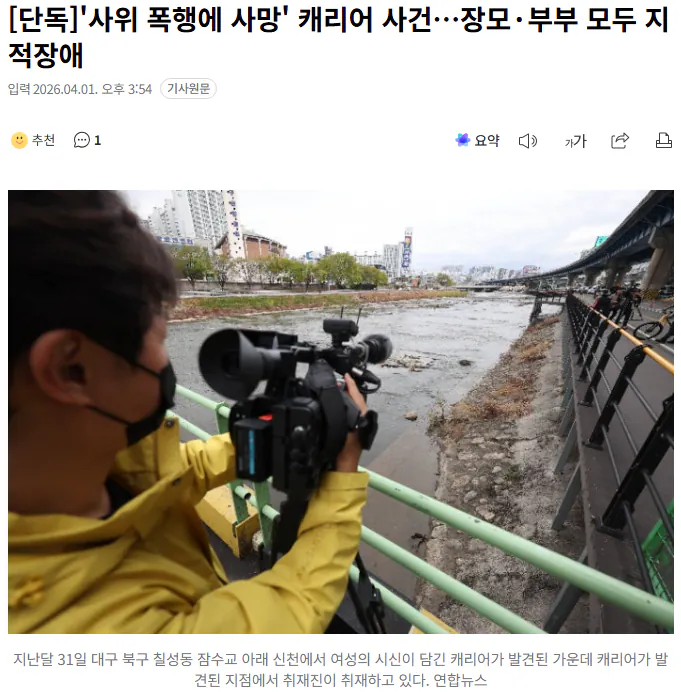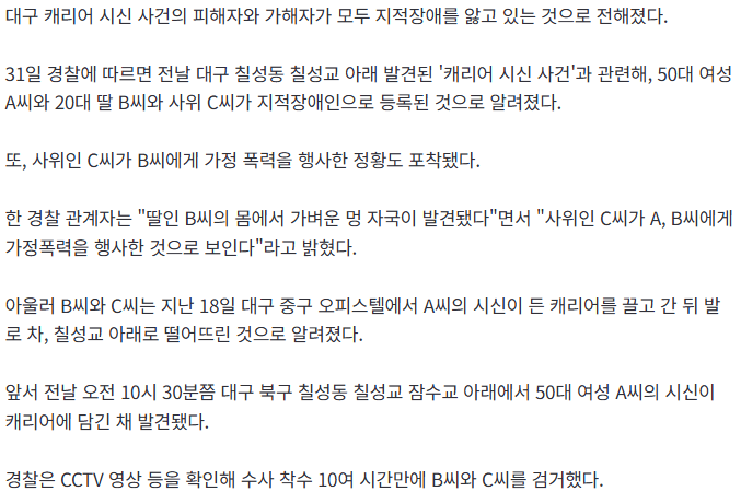 캐리어로 폭행한 끝에 사위가 사망한 사건이 발생했다. 가해자는 장모와 부부인데, 놀랍게도 관련된 인물 3명이 모두 지적장애를 가지고 있다는 사실이 드러났다.
