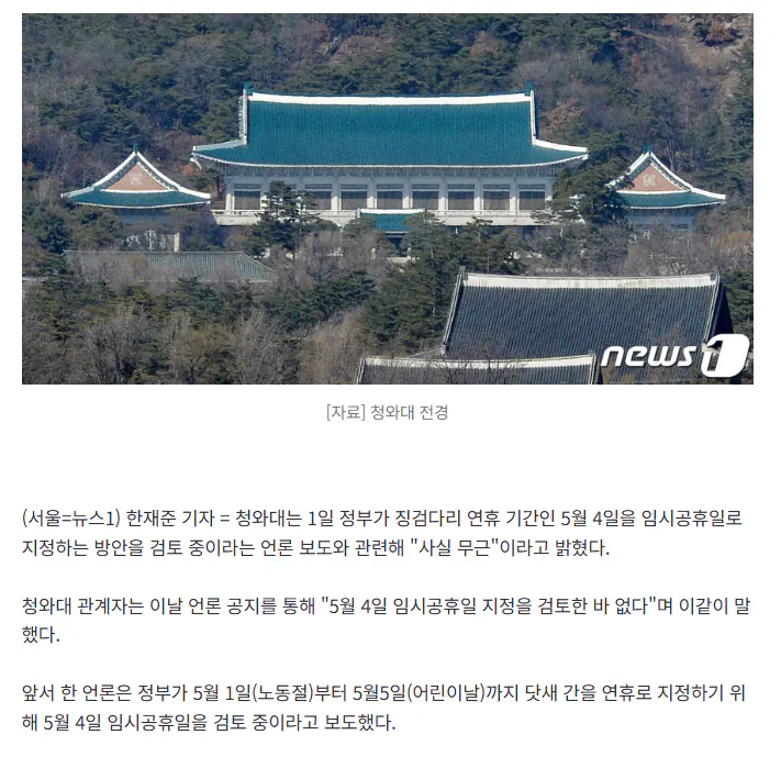 청와대 "5월4일 임시공휴일 지정, 검토한 바 없어"