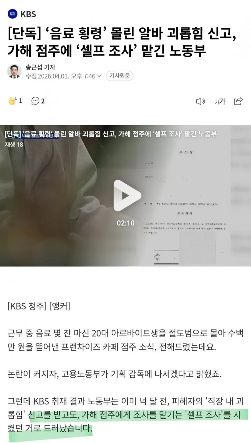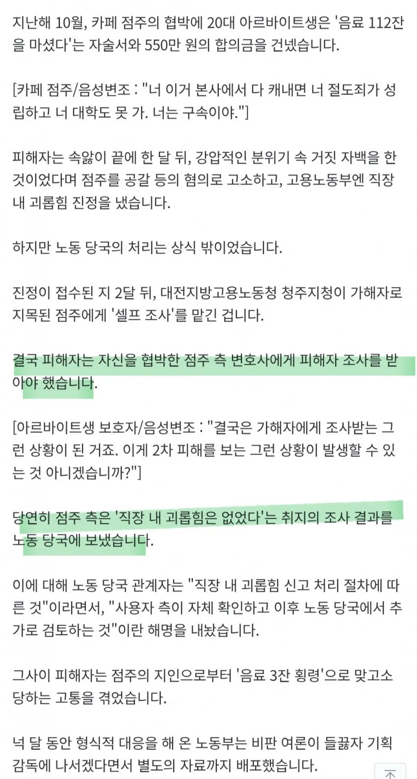청주의 한 음료점에서 알바가 음료 횡령 혐의로 몰려 점주한테 괴롭힘을 받았다. 피해자가 신고했지만 노동부는 가해자인 점주에게 조사를 맡겼다. 자기가 괴롭힌 사람을 자기가 조사한다는 건 말이 안 된다.