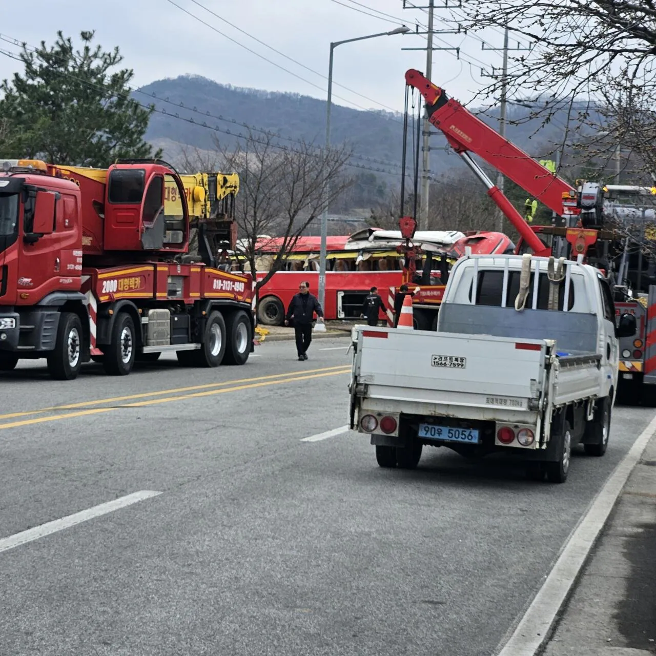 주차장이 부족해서 흰색 실선 위에 차를 세웠대(주정차는 가능했다고 함)읍내로 나가려고 사이드미러도 확인 안 한 채로 불법유턴을 감행. 원래 유턴 금지인 곳 위에 거울도 못 봤으니 정말 위험한 상황차 둘 다 완전히 박살버스 기사 포함 탑승객 26명 전부 중경상가드레일도 뚫고 떨어진 곳이 약간 비탈진데 그 아래 4~5미터짜리 벽돌 같은 게 쌓여있었다고. 사람이 안 죽은 게 정말 천만다행모두 안전운전 꼭 하세요