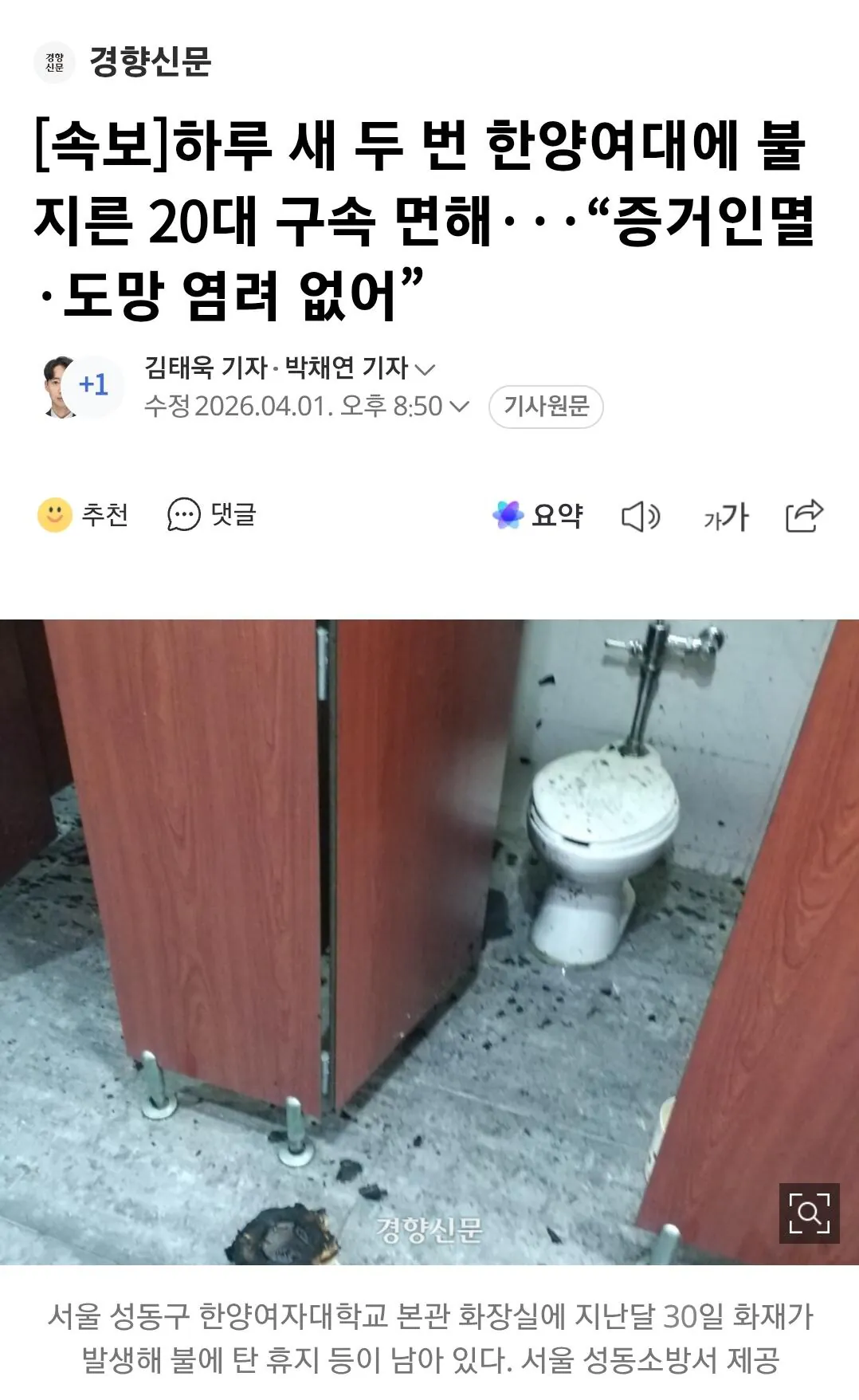 한양여자대에서 하루 동안 불이 두 번이나 났다. 혐의자는 20대 여성. 법원의 영장 실질심사 결과 도망이나 증거인멸 가능성이 없다고 판단돼 구속 승인이 떨어지지 않았다. 먼저 지난달 30일 오전 9시경 본관 지하 1층의 화장실 휴지통에서 불이 났고, 출동한 소방대가 20여 분 만에 진화했다. 그로부터 약 3시간 뒤 정오즈음 본관과 인접한 교수회관 9층에서 또 다른 화재가 발생. 학교 직원들이 현장에서 바로 진화한 뒤 경찰에 신고했고, 경찰은 교내에 있던 피의자를 긴급 체포했다.