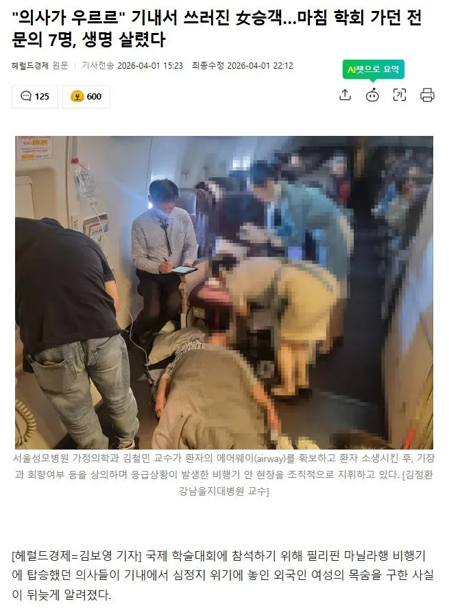 국제 의학 학술대회 참석을 위해 필리핀행 비행기에 탔던 의료 전문가들의 응급 대응 사건이 화제가 되고 있다.