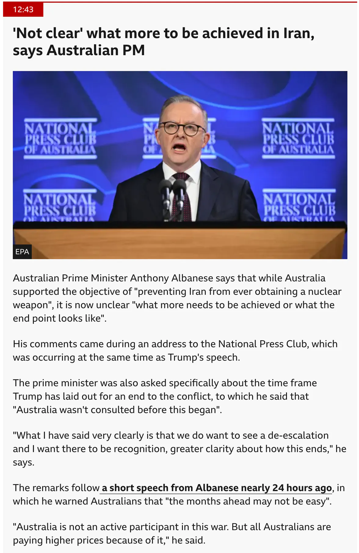 호주의 앨버니지 총리가 트럼프 미국 대통령의 이란 정책을 두고 의문을 제기했다. 이란의 핵무기 확산을 막자는 목표는 동의하지만, 지금 상황에서 구체적으로 뭘 이루려고 하는지, 그리고 어디서 끝낼 계획인지가 명확하지 않다는 취지다. 이 발언은 트럼프 대통령이 입장을 내놓은 것과 거의 같은 시간에 호주 국가기자클럽 연설에서 터져나왔다. 앨버니지는 이 사태가 본격화되기 전에 호주가 미국으로부터 사전 협의를 받지 못했다고 지적했으며, 앞으로의 진행 과정과 최종 결과에 대해 더욱 투명한 설명이 필요하다고 강조했다.
