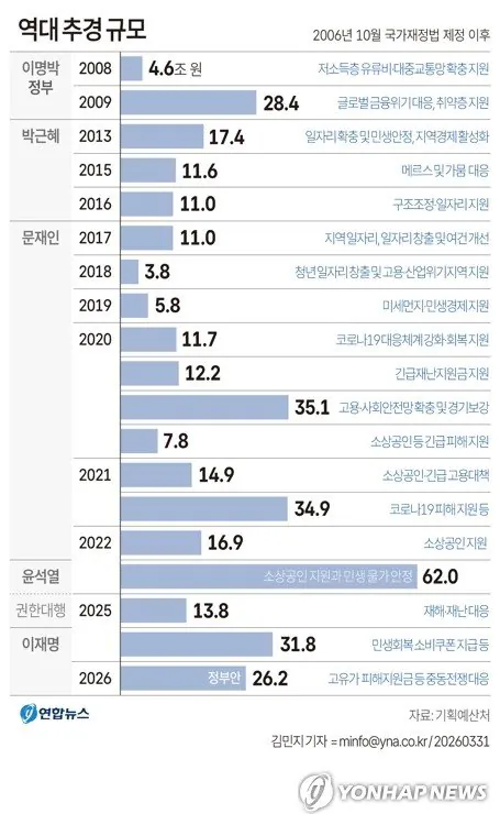 각 정부의 추경액을 보면이명박 33.0조, 박근혜 40.0조, 문재인 155.1조, 윤석열 75.8조, 이재명 58.0조한 정부의 규모가 유독 크긴 하네.. 이 정도까지 차이 나다니