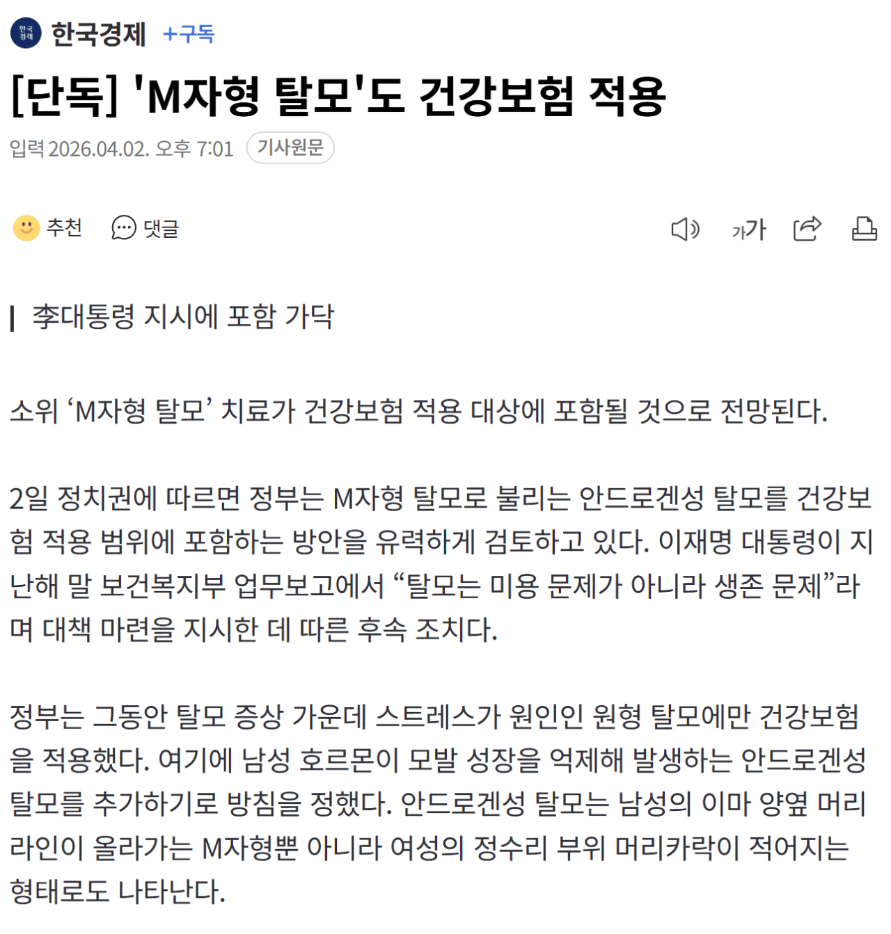 M자 탈모도 이제 건강보험 적용 대상이라네