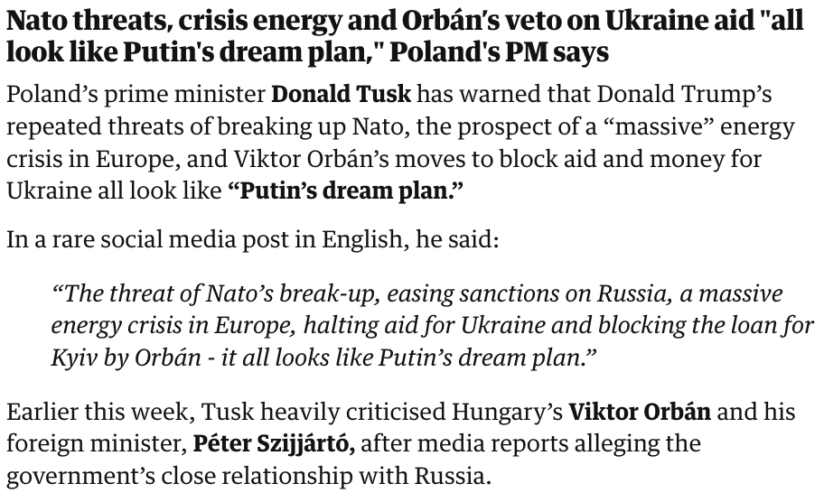 폴란드의 도날트 투스크 총리가 최근 영어로 작성한 SNS 글을 통해 현재의 국제 정세가 푸틴의 그림 속에 있다고 경고했다. 나토의 결속이 약화되고, 유럽이 에너지 위기에 처하고, 헝가리의 오르반 총리가 우크라이나 지원을 거부하는 상황 모두가 러시아의 이익과 정확히 맞아떨어진다는 분석이다. 투스크 총리는 트럼프 전 대통령의 나토 탈퇴 압력, 심각해지는 에너지 공급난, 그리고 오르반의 우크라이나 외면 정책이 모두 푸틴이 원하던 상황이라고 지적했다.