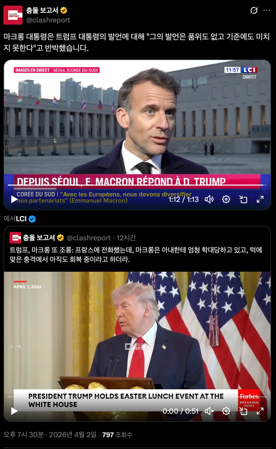 마크롱은 그런 발언들이 얼마나 저급하고 품위 없는지 지적하면서 굳이 대꾸할 필요가 없다고 잘라 말했다. 현재 우리가 해야 할 일은 긴장을 낮추고 상황을 안정시키는 것이라고 덧붙였다.