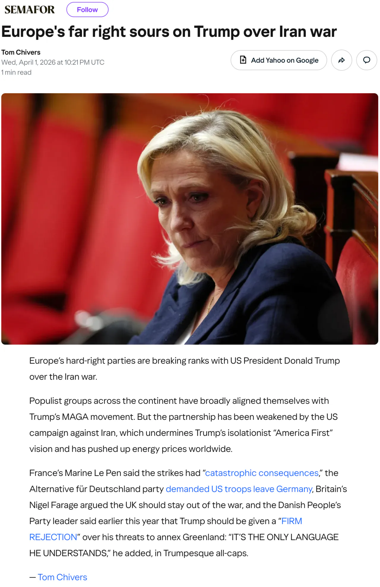 미국의 대이란 군사 개입을 놓고 유럽의 극우파 진영이 트럼프와 거리를 두고 있다.