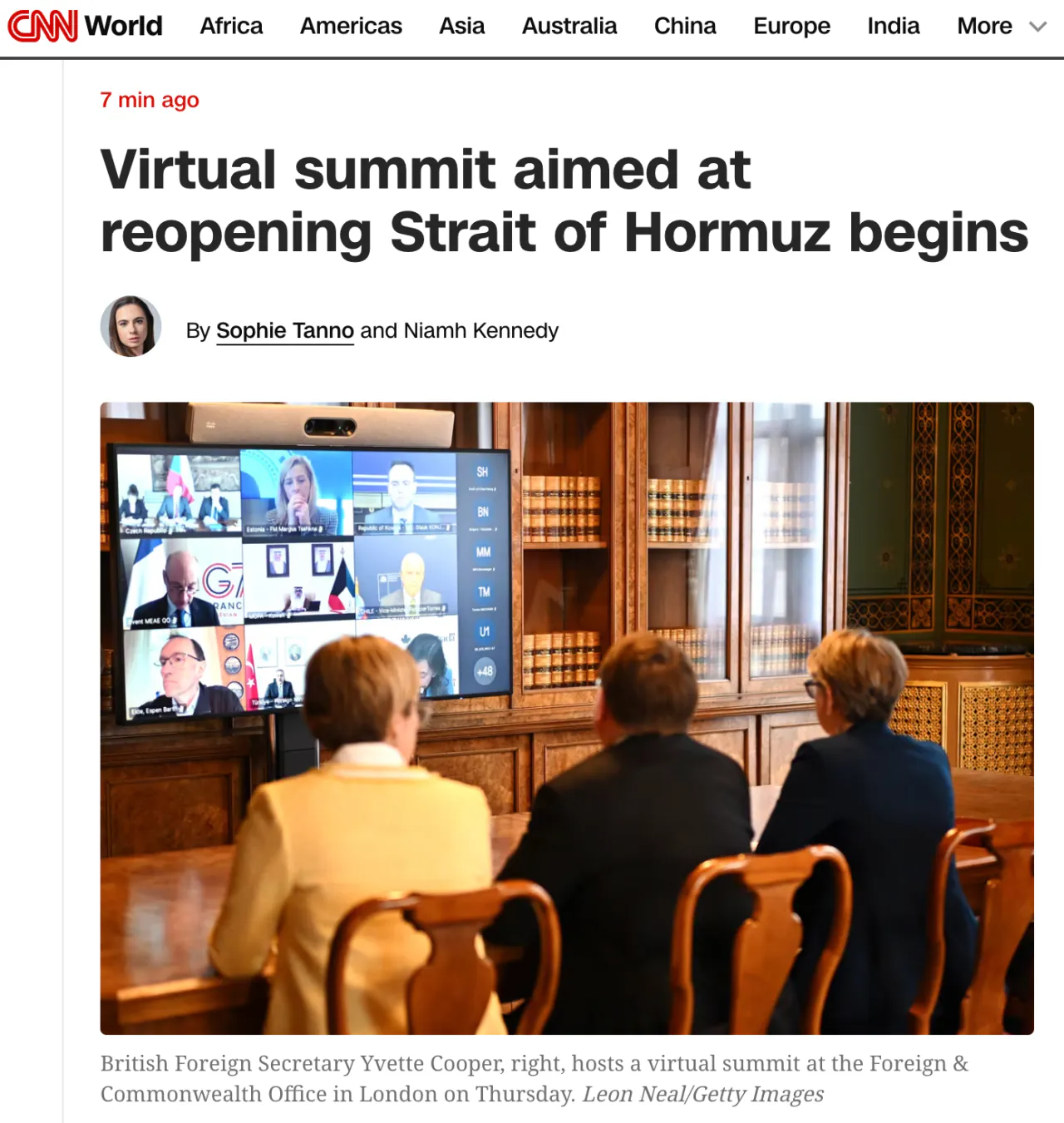영국이 주도해서 호르무즈 해협 재개방 문제를 논의하는 화상 정상회의를 개최했다고 한다. 전 세계 40개국 넘게 참여했는데, 영국 외무장관이 이란의 불성실한 태도를 강하게 비판했다. 지난주 영국 총리가 35개국 이상이 참여하는 회의를 열겠다고 예고했는데, 실제로는 그보다 많은 국가들이 참석했다. 다만 미국은 이 회의에 포함되지 않았다. 이란이 호르무즈를 폐쇄하면서 분쟁과 무관한 나라들도 영향을 받고 있고, 전 세계 경제가 타격을 입고 있는 상황이라고.