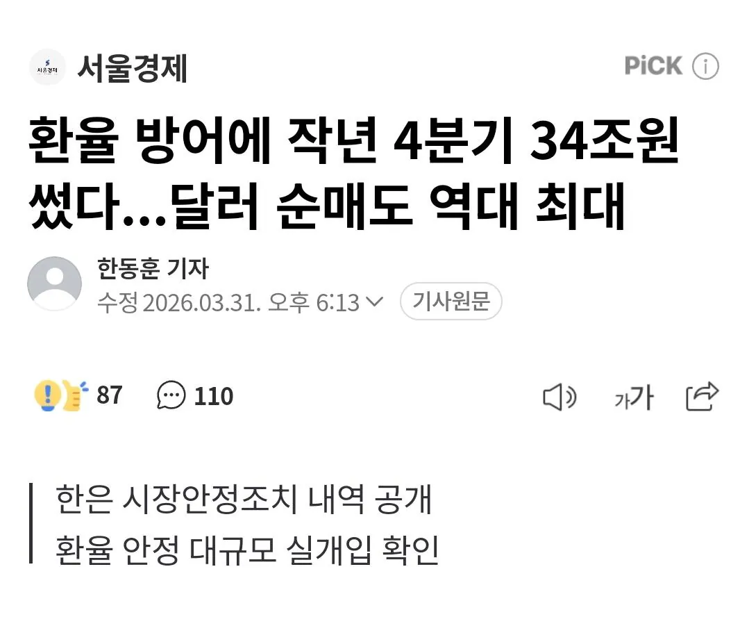 지난해 4분기에 환율방어 차원에서 사상 최고 규모인 34조를 투입했대정말 심각한 건 이 정도면 국가도 연금이라는 최후의 수단을 쓸 수밖에 없을 정도라는 거그런데도 달러는 계속 오르고만 있네