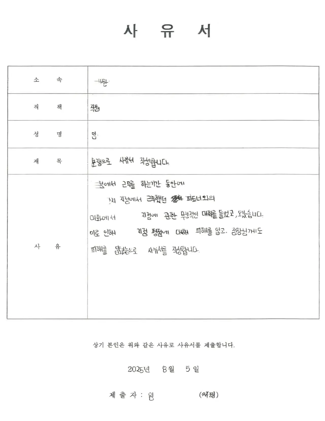 한 직원이 퇴근 후 동료를 만났을 때 점주에 대한 뒷담화가 오갔다고 한다. 어쩌면 알았는지 의아스럽지만, 점주가 이를 알아채고 당사자를 불러 사유서를 작성하라고 강요했다고 한다.물론 이건 녹음된 게 아니고, 기자로부터의 제보일 뿐이다. 사유서가 정말로 작성되었는지도 불명확하다고 한다.