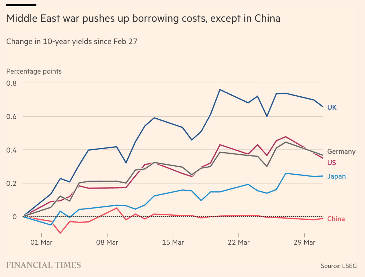 지정학적 위험이 커지면서 전 세계 채권 시장이 흔들리고 있습니다. 그 와중에 중국 국채만 유독 강한 모습을 보이며 투자가들의 관심을 받고 있네요. 1일 기준 중국의 10년물 국채 수익률은 1.81%로 내려갔지만(가격은 올랐다는 뜻), 미국과 영국은 물가 우려로 국채 금리가 각각 0.38%p, 0.7%p 급상승했습니다.