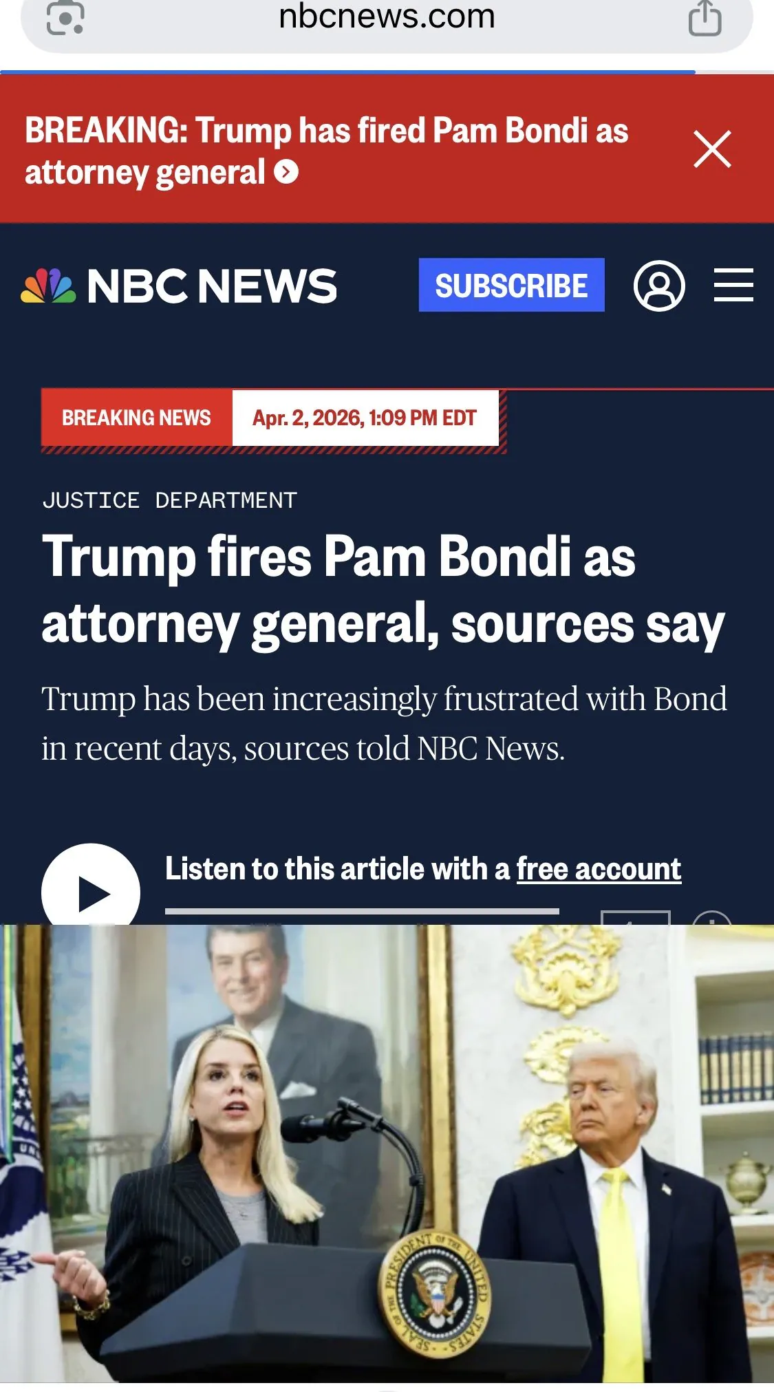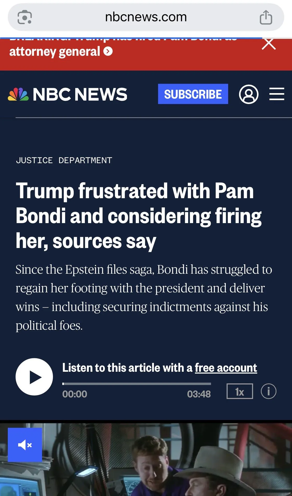 파면 고려 중이라는 소식이 나온 지 24시간도 못 돼서 결국 파면이 확정됐다. 팸 본디가 누군지는 말할 것도 없음 - 트럼프와 엡스타인 문제에서 필사적으로 자신을 방어하던 그 사람이다. 거기다 자기 책상 위에 있던 자료들을 슬리피 조는 왜 공개 안 했냐는 말도 돌고 있고 ㅋㅋㅋ