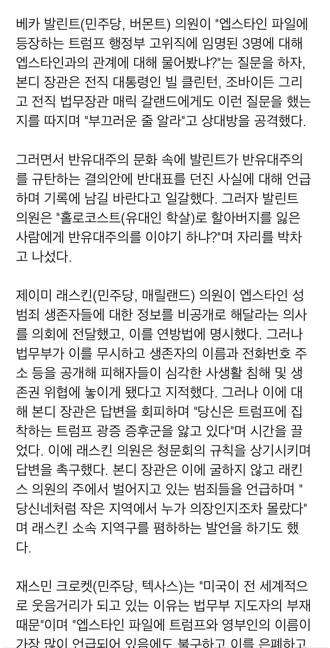 팸 본디가 어떤 사람인지는 트럼프 엡스타인 리스트 온몸비틀며 방어했던 사람인거로 설명이 될거라 갈음함 사족으로 쟤 저거 자기 책상 위에 있니 슬리피 조는 공개를 안 했니 하는 소리도 존나 함 ㅋㅋㅋㅋㅋ