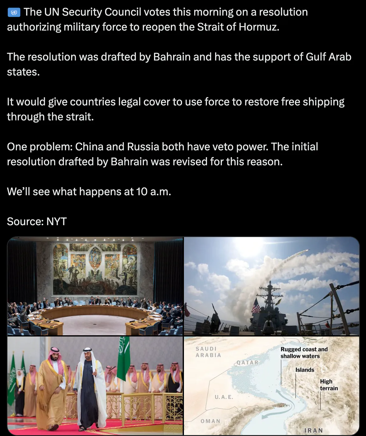 유엔 안전보장이사회는 호르무즈 해협의 자유로운 항해를 보장하기 위해 무력 사용을 승인하는 결의안을 오늘 오전 표결 예정이다. 바레인이 주도한 이 결의안은 걸프 지역 아랍국들의 강력한 지지를 받고 있다. 결의안이 승인되면 각국은 호르무즈 해협에서 항행권을 복원하기 위해 군사력을 행사할 수 있게 된다.