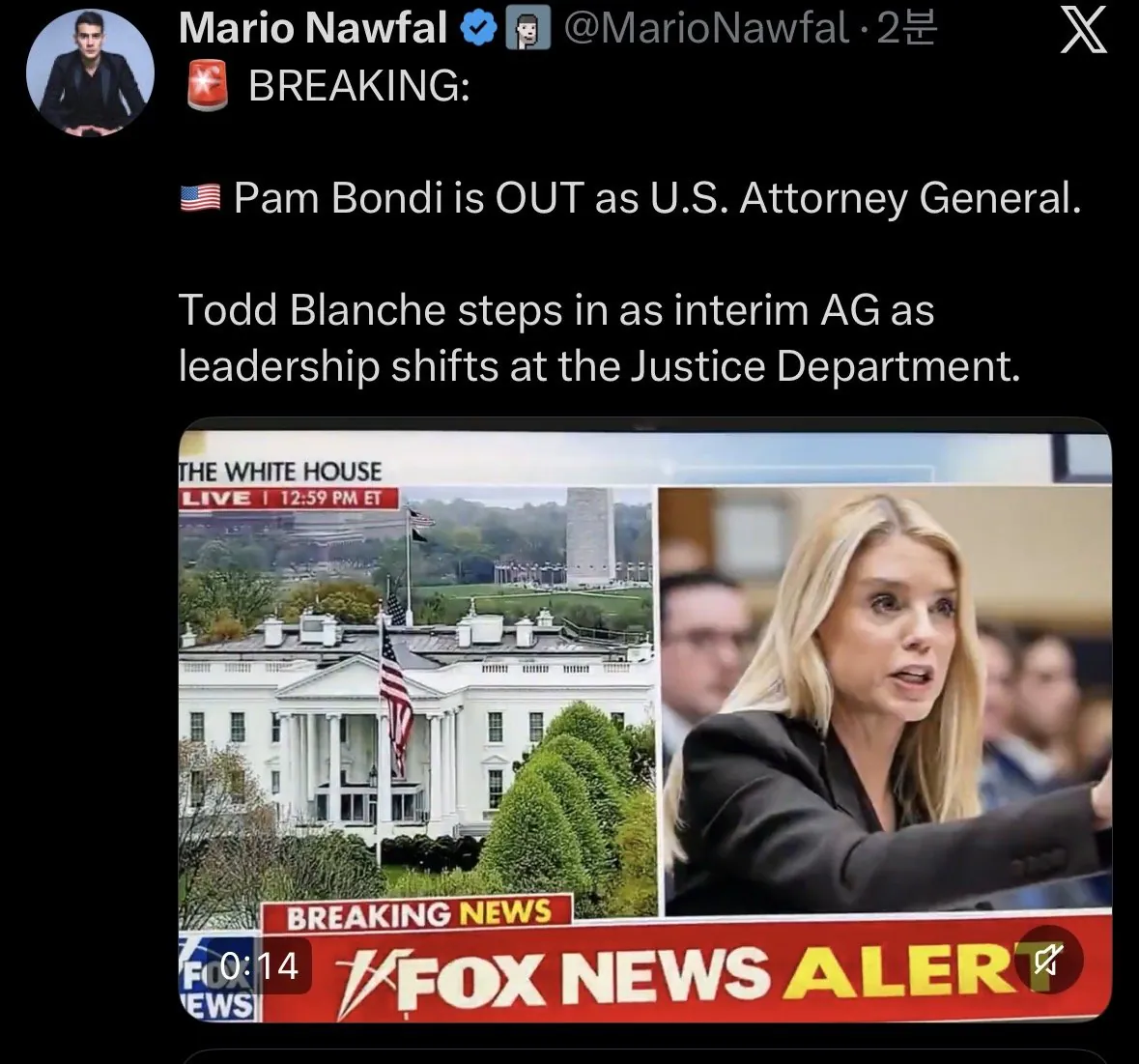 에프스타인 사건 처리와 민주당 세력 숙청을 트럼프와 극우 진영의 기대대로 진행하지 못했다는 평가가 나왔다.토드 블랜치 대행이 새로운 법무장관으로 임명되는데, 그는 트럼프의 성추문 관련 건에서 개인 변론을 담당해온 핵심 측근이다.