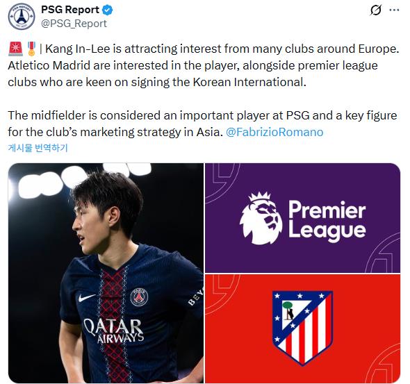 이강인이 파리에서 중요한 포지션을 유지하고 있는 가운데, 유럽의 여러 클럽들이 그를 노리고 있다.아틀레티코는 수개월 전부터 그를 주시해오고 있었고, 프리미어리그팀들도 호의적인 관심을 드러내고 있는 상황이다.아시아 시장의 마케팅 가치까지 고려하면, 그의 이적은 단순한 축구선수 영입 이상의 의미를 가질 것으로 예상된다.이제 유명 기자도 나서면서 본격적인 이적 루머가 시작된 것 같다.