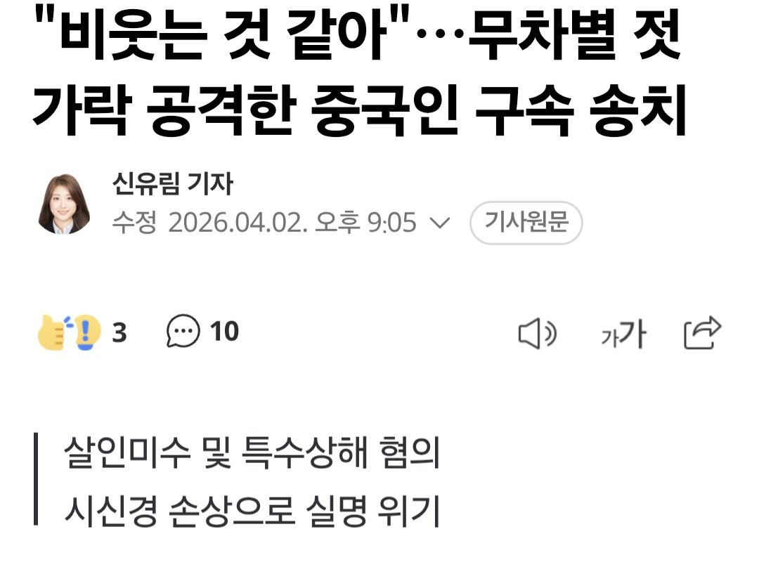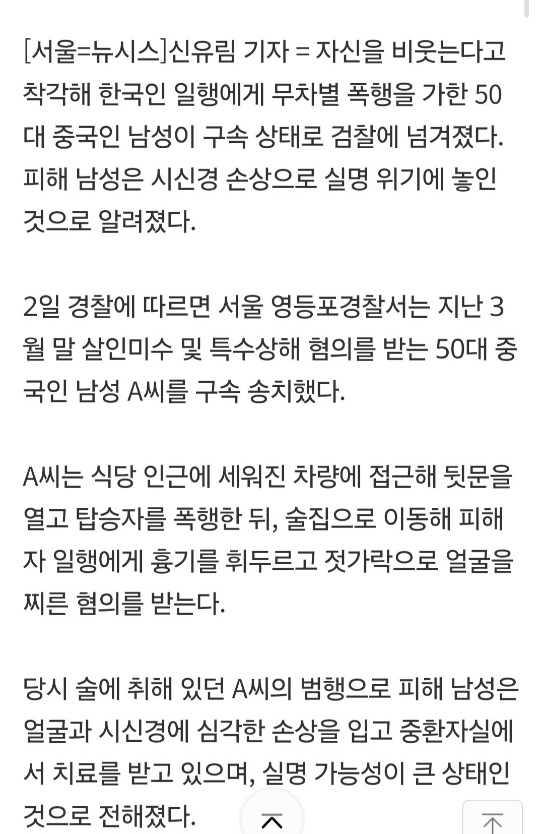 중국인이 한국인 눈 젓가락으로 찔러서 실명위기라고 함