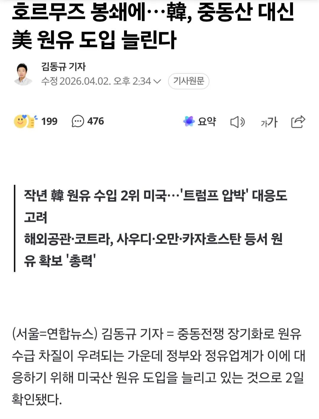 트럼프가 직접 나섰고 우리 정부와 정유사들도 응하려는 모양이다. 지금까지 원유 수입 구조를 보면 중동산이 대부분이었는데(약 70%), 미국산은 전체의 16% 정도에 머물렀다. 국제 정세가 불안한 만큼 앞으로는 미국산 비중을 더 늘려서 조달선을 다각화하려는 의도인 것 같다.