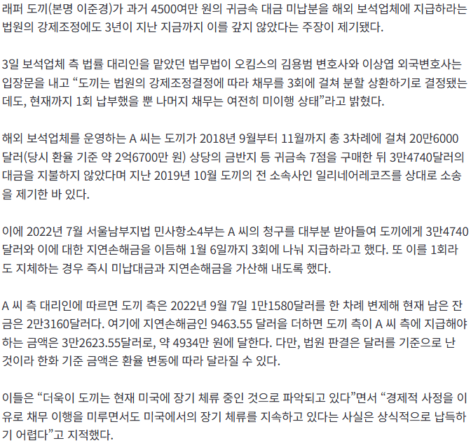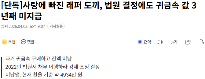 래퍼 도끼가 귀금속 값을 놓고 벌어진 분쟁에서 법원 판정을 받았다.하지만 판정 이후 지난 3년 동안 해당 금액을 내지 않고 있는 상황이 계속되고 있다.사랑에 빠져 있는 와중에도 이 문제는 미결로 남아 있다는 게 핵심이다.