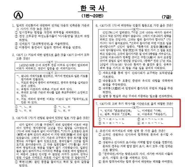 가장 심했던 게 7번 문항인데, 고려 후기 역사서들을 시간 순서대로 정렬하는 문제였음.