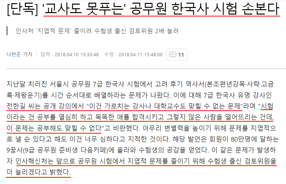 2018년 3월 24일 실시된 서울시 7급 공무원 시험 한국사 시험이 너무 지엽적으로 나와서, 당시 한국사 스타 강사인 '전한길'이 공개적으로 비판한 사건.