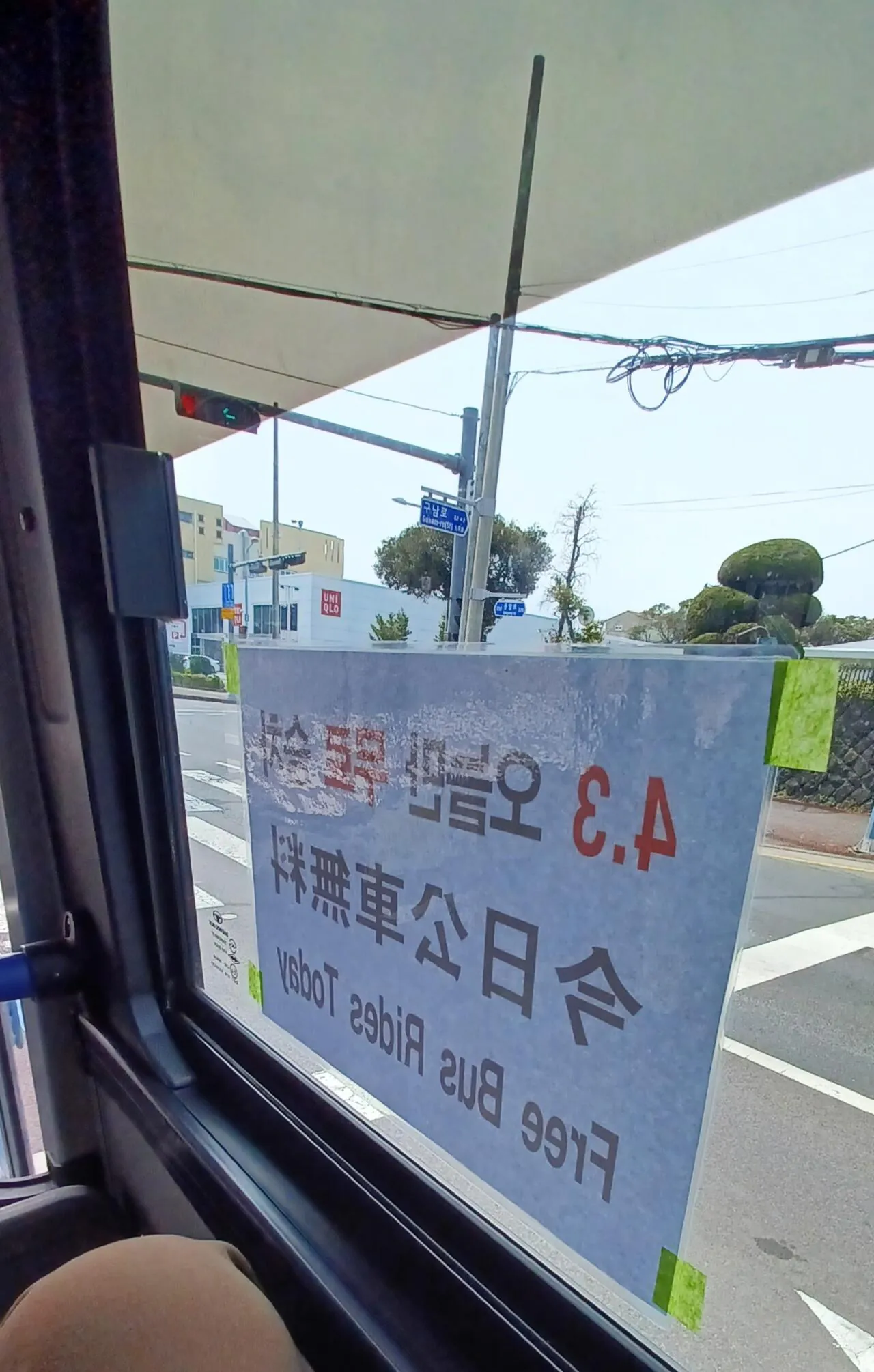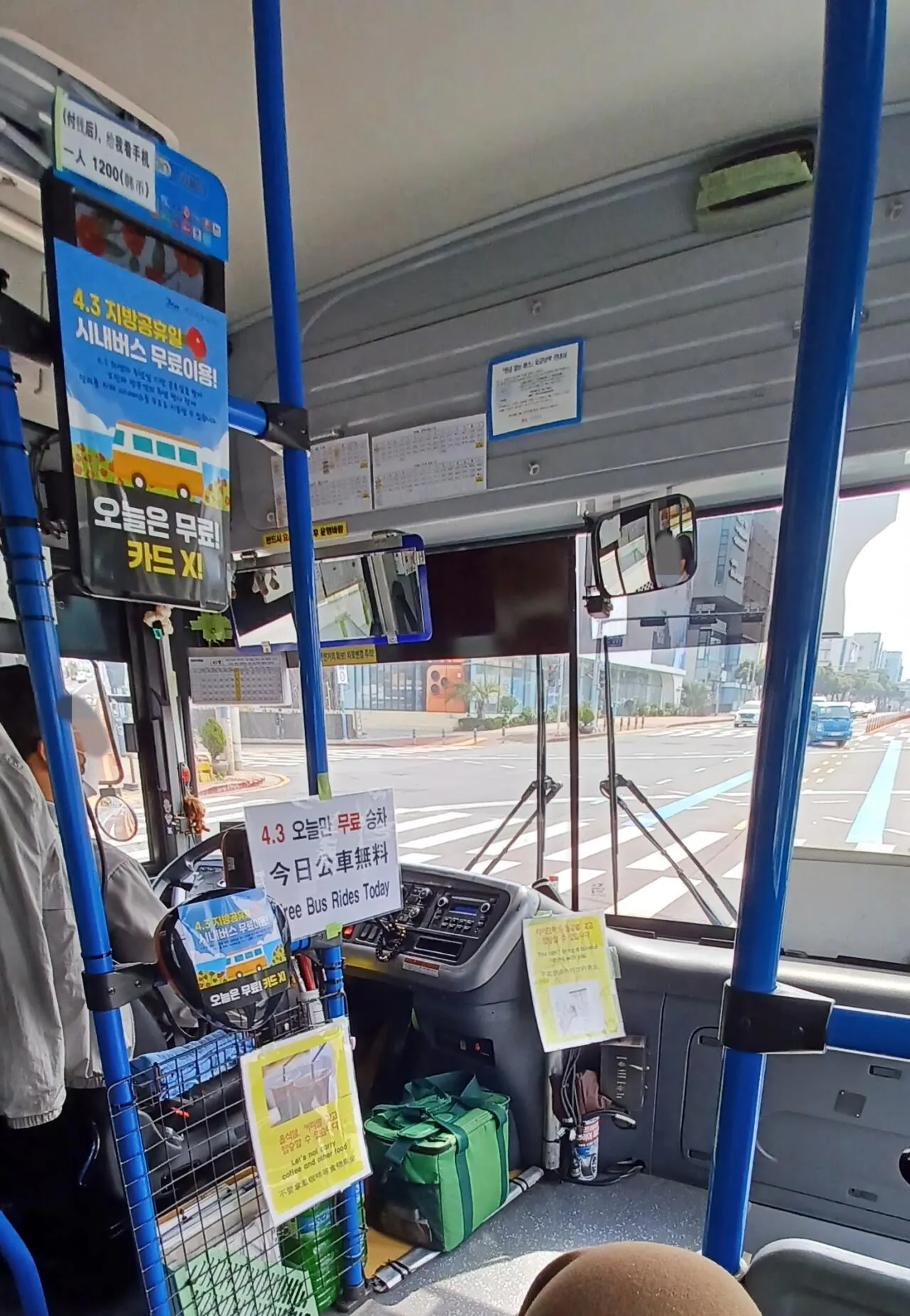 4.3 추념을 맞춰 제주도의 모든 시내버스가 무료 운영 중. 올해 새로 시작된 거라 카드 태그 없이 탈 수 있다고.제외 노선은 우도관광지순환·해안도로 순환·시티버스(921, 922, 1111, 1112, 1113번).준비 시간이 부족했는지 정류장이나 버스 정보판에 알림이 없었고, 사전 홍보도 미미해서 카드를 챙겼던 승객들이 버스 옆 스티커 보고서야 무료인 걸 알게 됐다고 함.