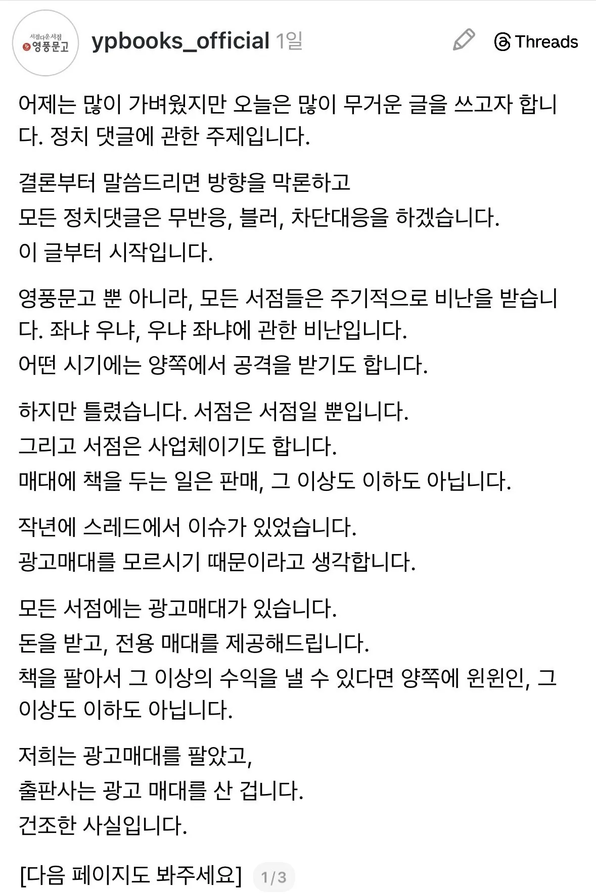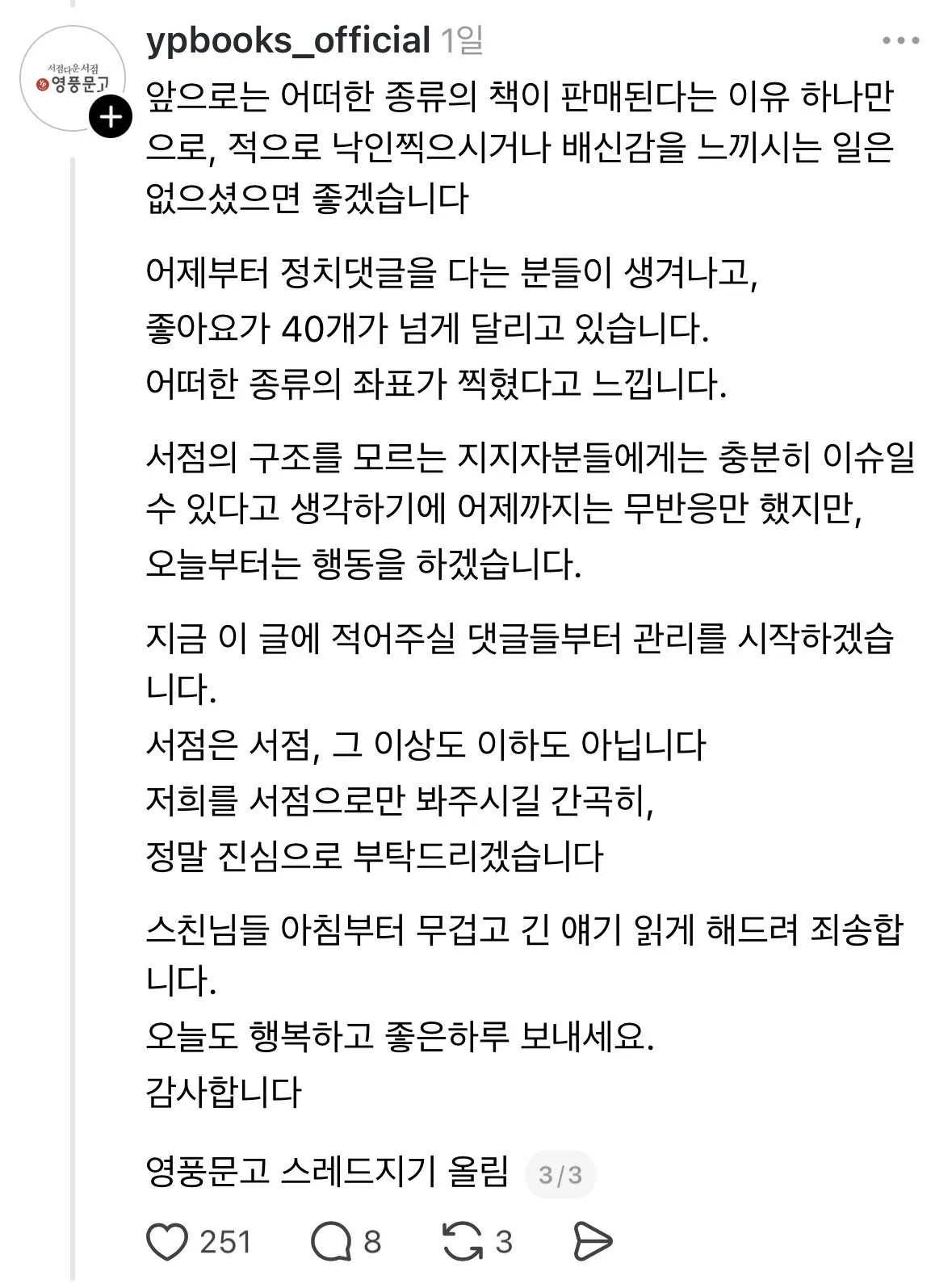 서점 SNS 담당했다가 정치 댓글로 정신없네
