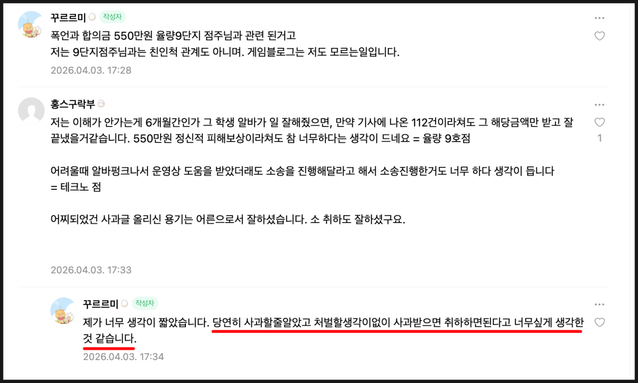 해당 댓글들은 현재 삭제 중이다(참고: https://cafe.naver.com/jihosoccer123/3603010) 상세 내용: https://www.fmkorea.com/9667176585 게시글 본문만 봐도 '(550만원 합의금을 챙긴 점주)의 간청 때문에 고소를 진행했다'고 명시되어 있는데, 거의 자술하는 수준이다. 그런데 댓글에서는 또 '처벌 의도는 없고 그냥 사과받고 취하할 생각이었다'고 주장하네ㅋㅋㅋ 명백히 무고죄는 성립 안 될 듯하지만, 남의 일에 이렇게까지 개입해서 하는 짓이 정말 악질 수준이다