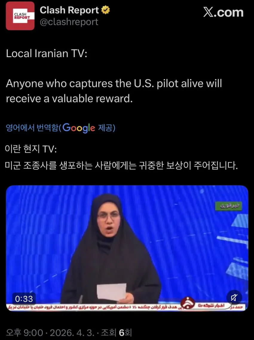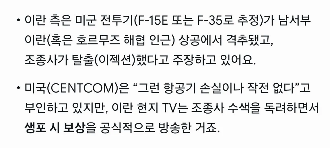 미군 F-15 조종사 생존 여부 불투명, 격렬...
