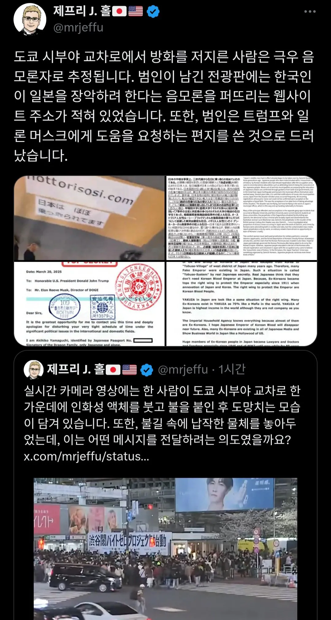 시부야 교차로의 방화 사건 범인이 밝혀졌는데, 극우 진영의 음모론에 심취한 인물이었다고. 한국인이 일본을 조종한다는 터무니없는 이야기를 진심으로 믿고 있던 극단주의자였던 거