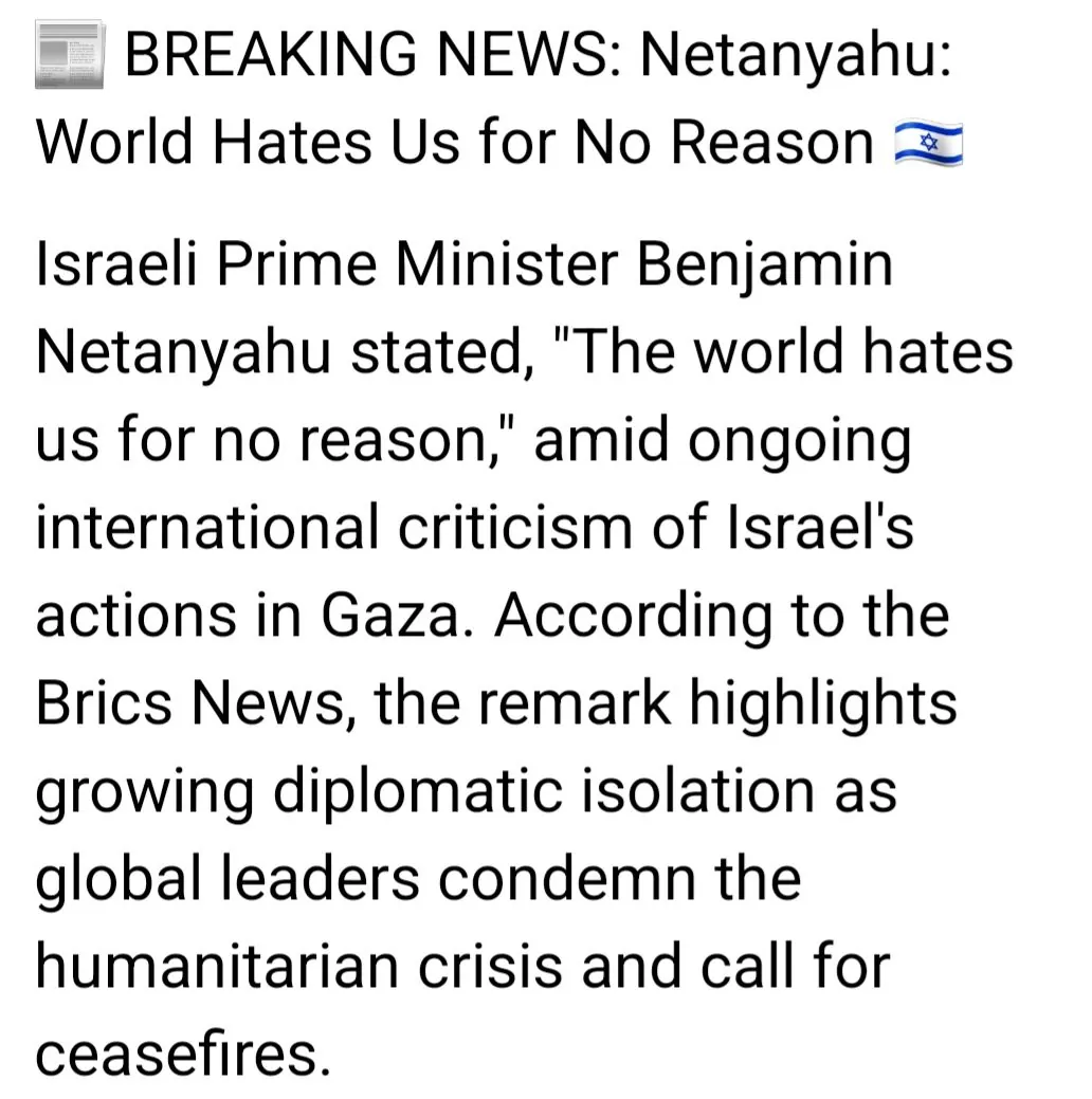 국제사회가 정당한 근거 없이 이스라엘에 대한 적대적 태도를 취하고 있다고 지적했다. 이스라엘 측은 전 세계의 일방적인 비난이 불공정하다고 주장했다.- 이스라엘 총리