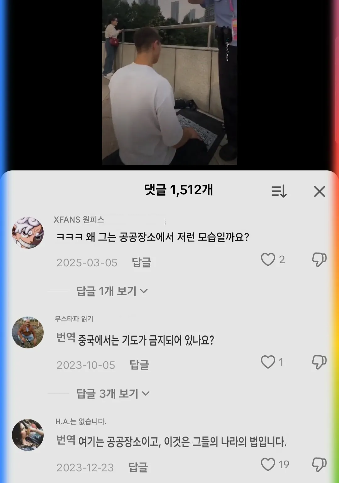 요즘 한국에 무슬림 이민자 숫자가 계속 불어나고 있는데, 길거리에서 기도하는 거 자주 볼 수 있게 됐다고 함중국에서도 비슷하게 공공장소에서 예배보는 무슬림들 때문에 문제가 생기고 있다네근데 재밌는 게 댓글 보니까 정작 무슬림들 사이에서도 남의 나라 공공장소에서 이렇게 예배하는 거 대놓고 하는 건 안 좋다는 의견들이 꽤 있다는 거
