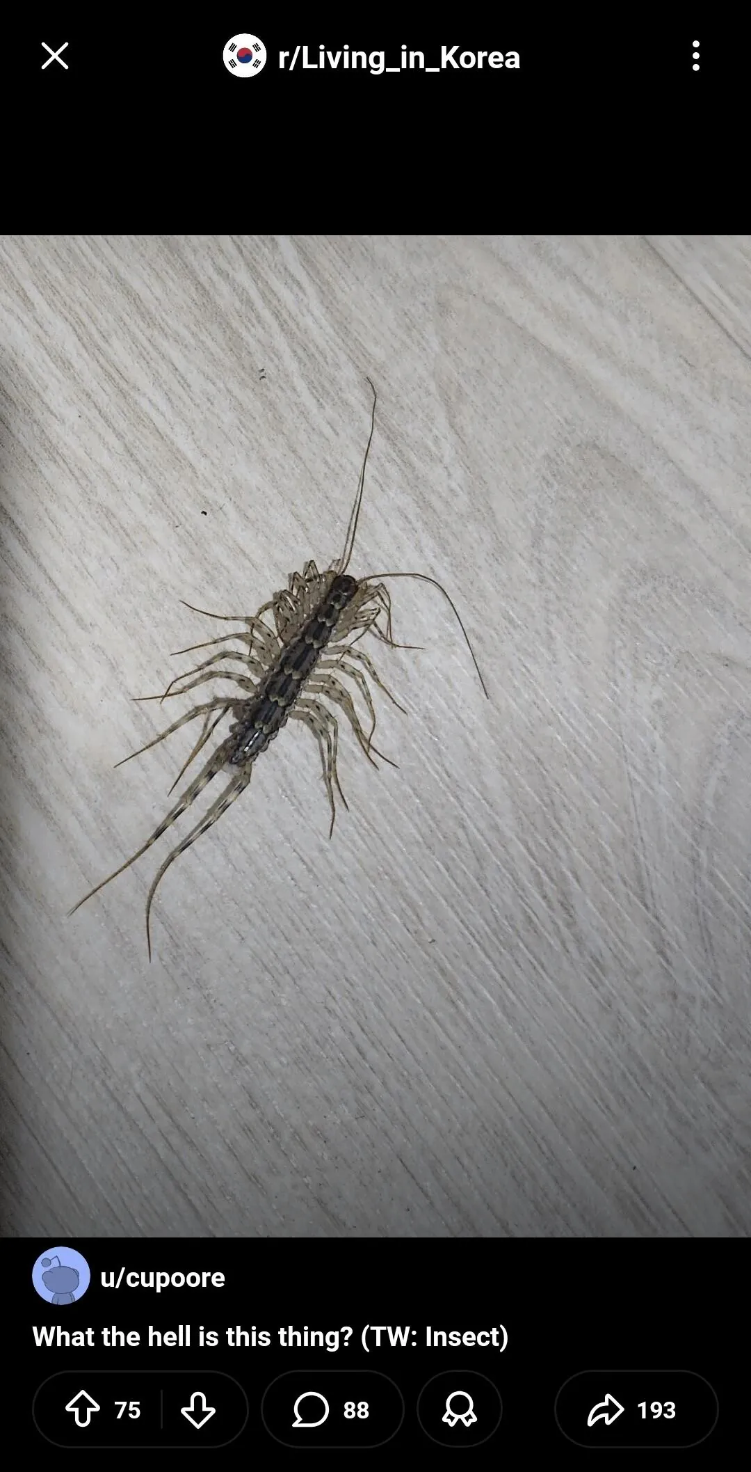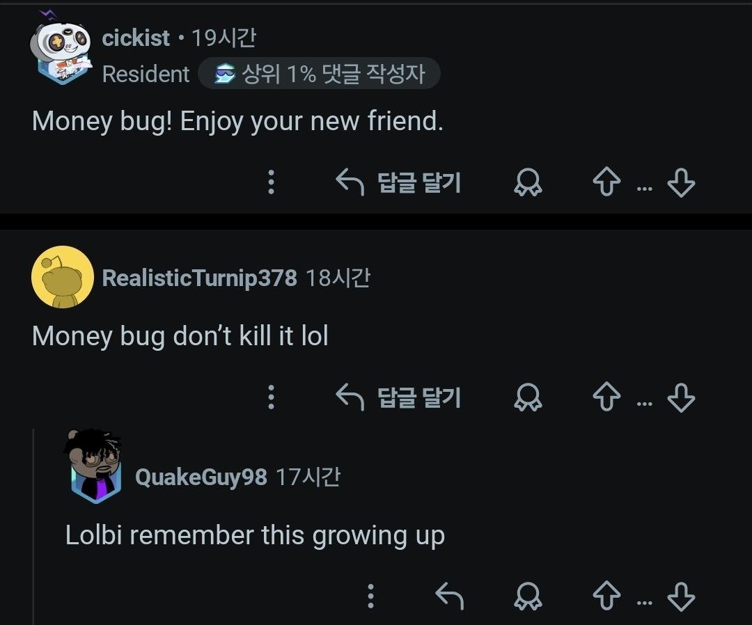 어 이게 뭐예요? 처음 보는 벌레인데...외국인들의 댓글:???: 그건 돈벌레라고 부르는 거야. 너랑 친해질 거야???: "Money bug"라고 불러. 절대 죽이지 마 ㅋㅋ???: ㅋㅋ 어린 시절 자주 봤던 벌레 같은데???: 사실 그건 좋은 벌레야. 집에 있는 해충들을 싹 잡아먹거든. 다만 그 벌레가 보인다는 건... 집에 바퀴벌레가 꽤 있다는 의미라고 봐도 돼