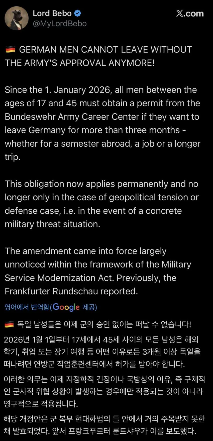 독일이 요상한 법을 만들었다고 한다. 17세부터 45세까지 남자들만 해외여행 갈 때 정부 허가를 받아야 한다는 거네. 여자들은 멀쩡히 나가는데 남자들은 허가? 이게 무슨 성평등이라는 건지 모르겠다.아...
