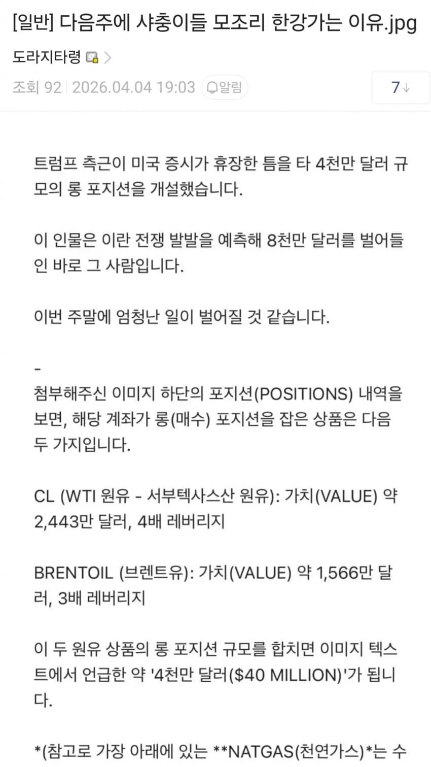 트럼프 측근 금요일 휴장 틈타서 4천만달러 규모 원유롱에 배팅ㅋㅋ